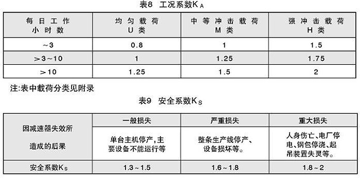 對一般重要程度,選用批量不大,連續運輸的減速器:均勻載荷K=1.5:中等沖擊載荷K=2;強沖擊載荷K=3。確定選用系數K,根據輸入電機功率和要求的傳動比i,從表4、5、6中選定減速器。