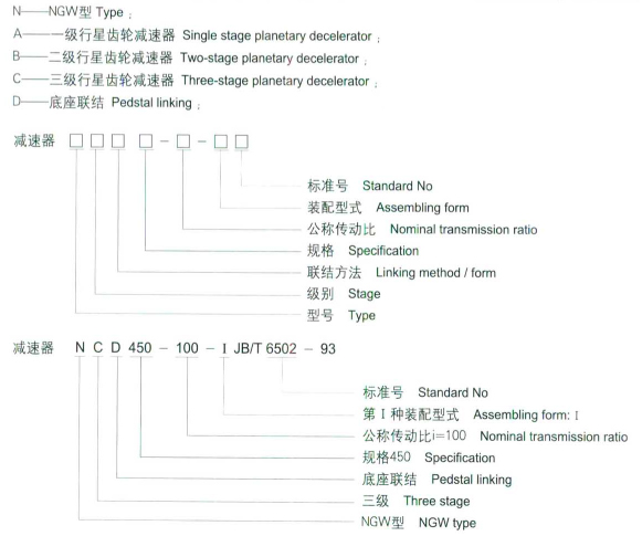 減速器代號包括,型號、級別、聯結、型式、規格、公稱傳動比。裝配型式,標準號。