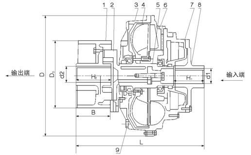 1制動輪,2連接軸,3外殼,4渦輪,5主軸,6泵輪,7后輔腔,8連接盤,9易熔塞